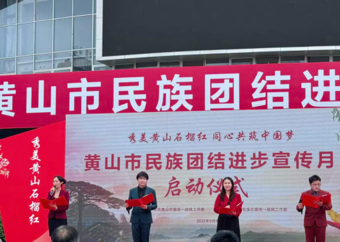 9月9日,由黄山市委统战部主办、屯溪区委统战部承办的“秀美黄山石榴红 同心共筑中国梦”黄山市民族团结进步宣传月启动仪式在屯溪区隆重举行,竞博jbo网页版师生受邀参加仪式。活动中,竞博jbo网页版学子深情朗诵了《我们是一家人》一文,以铿锵有力的声音传递了中华民族共同体意识,赢得现场观众的阵阵掌声。