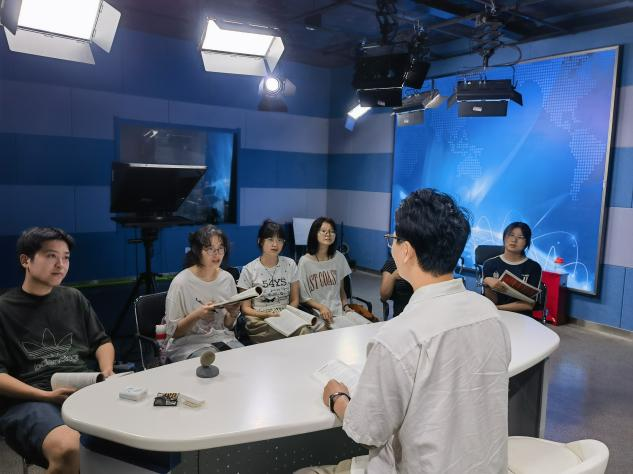 演练过程中,演播厅内还模拟了文化场馆的环境,通过调整灯光、摆放展品图片道具,让学员更快进入“解说员”角色。小课组成员之间也展开互评交流,分享各自对“如何平衡专业性与趣味性”的思考,现场形成互动的学习氛围。